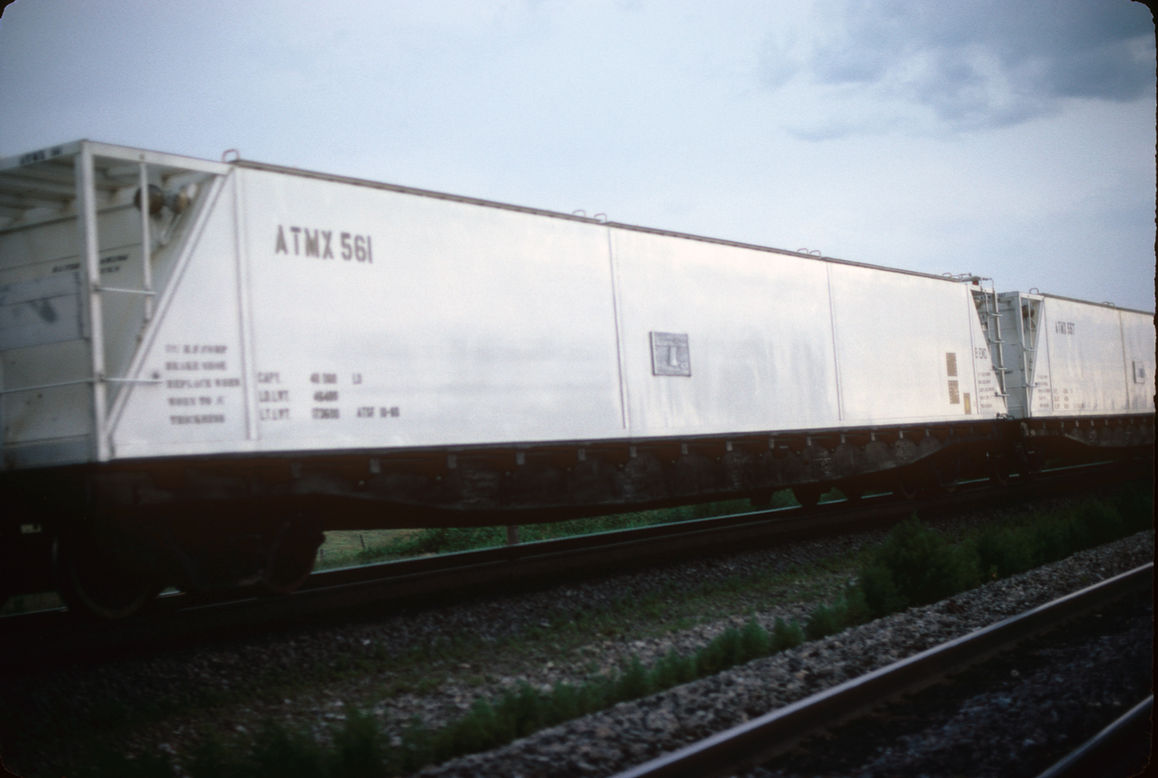 This is an interesting gallery of the White train, late in the history of shipping nuclear weapons by rail. The lead locomotive is Santa Fe 6379, a two-year-old General Electric B23-7 built in 1979 followed by an EMD diesel, possibly a GP-40. Note that there are no typical guard escort cars (with their distinctive cupola for guards). The train’s consist is composed of TSSX G-20 followed by what may be a power buffer car, then what appears to be 13 cargo cars, TSSX G-31 (probably a 40’ former kitchen car), and Santa Fe CE-1 caboose 999201. The trains dispatched to/from the Pantex Plant typically utilized an 80-foot coach (USAX G-20, G-23 and/or G-24) on one end of the train, typically a former converted hospital car, and a 40-foot coach (USAX G-30 or G-31) on the opposite end of the train, typically a former Troop Kitchen car. At some date the USAX marking was replaced with TSSX. This paragraph was added from information found in the Amarillo Railroad Museum files.