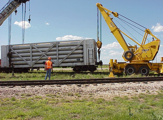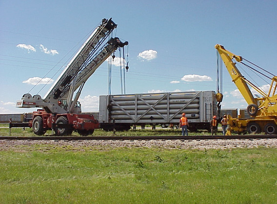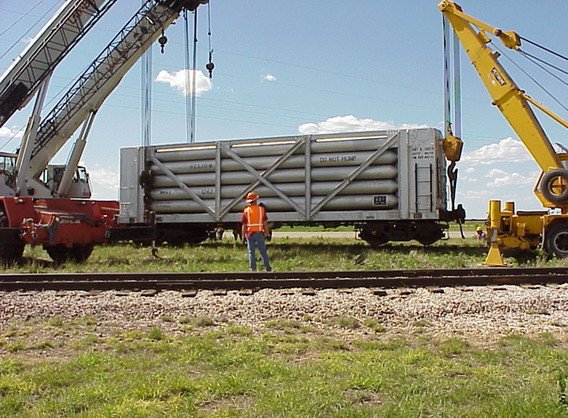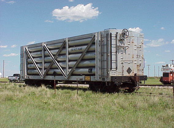 When we received our helium car from the U. S. Bureau of Mines, it arrived unexpectedly. In fact, the car was delivered to the AT&SF yard in Amarillo and the yardmaster had no idea what he was supposed to do with it. Thankfully, an ARM member noticed the car and made the proper inquires and the car was properly billed. But that is only half the story. It was billed to the ARM, but we had no way to get the car onto our tracks since there is no switch connecting our tracks to the BNSF. Fortunately, a local pallet company near our property allowed us to store the car at the end of their siding for about two years. They finally got tired of looking at it and asked that we move it. A few months later, Jackie Messer Construction, doing some contract work for precision Rail in Amarillo, graciously moved the car from the pallet plant to our tracks. The photos tell it all.